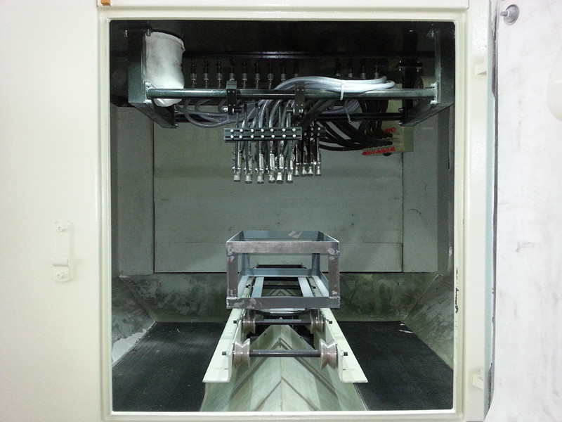 該設(shè)備是根據(jù)不銹鋼水槽產(chǎn)品特性而專門設(shè)計(jì)的(非標(biāo)準(zhǔn)型)轉(zhuǎn)動(dòng)式自動(dòng)噴砂機(jī),完全適合購(gòu)方所提供的產(chǎn)品。根據(jù)購(gòu)方對(duì)產(chǎn)品效率的要求,設(shè)備采用轉(zhuǎn)動(dòng)推車式噴砂機(jī)。